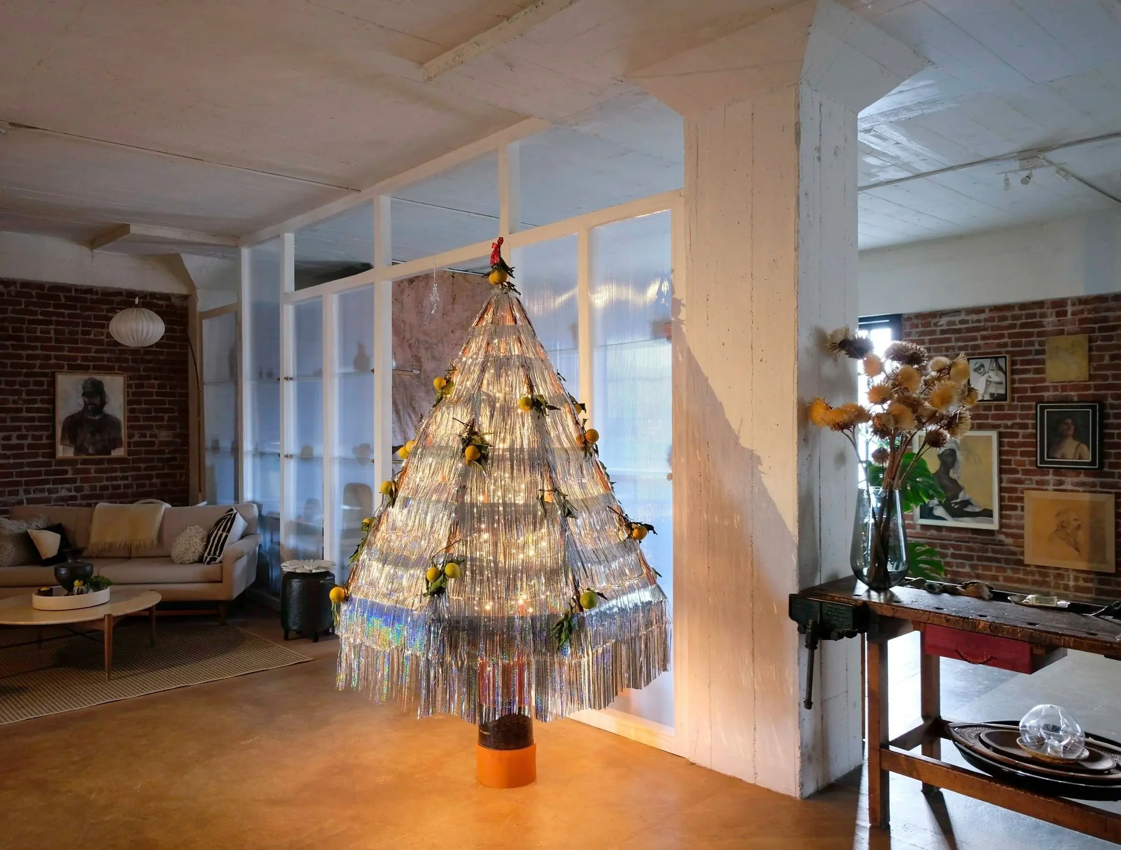 Salvaged patio umbrella armature covered in tinsel garlands and citrus. What’s more festive than that?